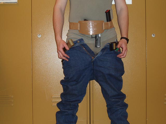 OLYMPUS DIGITAL CAMERAZiehen/Holstern: Das ziehen funktioniert ein wenig – unorthodox. Man bringt erst die Unterstützungshand vor die Mündung (Bild) und drückt die Pistole quasi nach oben aus dem Holster, während die Waffenhand sie greift und in Position bringt. Sozial ist das unauffällig, Männer greifen sich bekanntlich immer an den Sack. Hierbei muss gesagt werden, dass man also „sweept“ um einen erstmals nicht besondern sauberen Griff an der Waffe zu erhalten, den man meist auch nachbessern muss. Des Weiteren funktioniert das Ziehen aus dem Sitzen in Straßenkleidung überhaupt nicht. Das Holstern funktioniert allerdings meist anstandslos, hier gibt es keine Kritikpunkte.