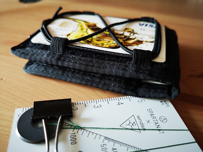 Unter die Gummibänder an der Vorderseite kann man super seine Kredit-/ Bankkarte klemmen oder ein Telemeter. Im Bild ist unser Kooperationsprodukt mit WNDSN zu sehen, das Planzeiger Telemeter. Das hält besser als man erwarten würde und die Karte bzw. das Telemeter ist schnell Griffbereit.