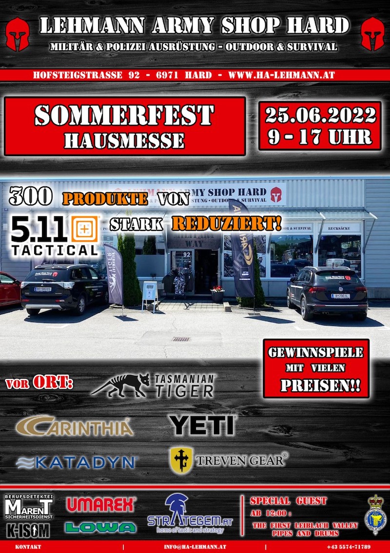 Seid dabei beim großen Sommerfest vom Lehmann Army Shop in Hard. Bei der Hausmesse könnt ihr euch von Kopf bis Fuß ausstatten. Für euch sind diverse Markenvertreter vor Ort, zum Beispiel Carinthia, Tasmanian Tiger, Treven Gear, Katadyn, Yeti und viele mehr. An diesem Tag gibt es für euch top Rabatte sowie Gewinnspiele mit tollen Preisen.