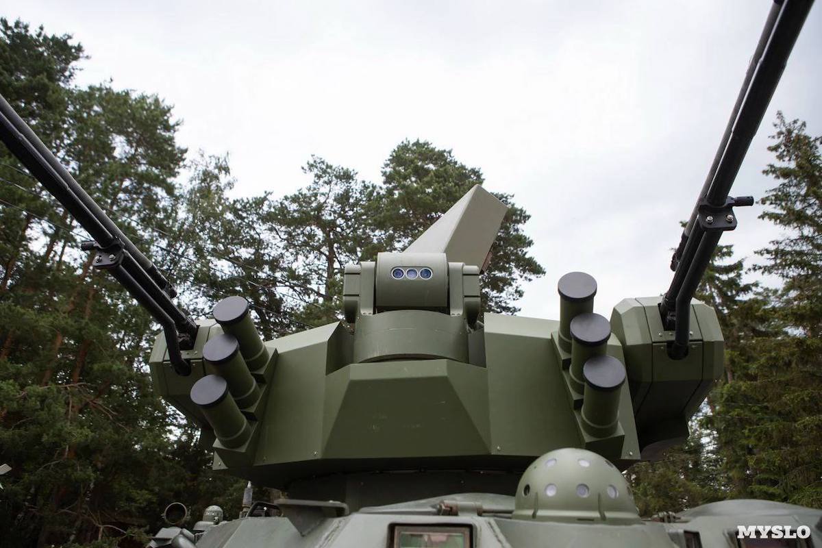 Irgendwie „poor mans Gepard“: Der russischer BTR-82A hat ein neues Flugabwehrmodul bekommen. Der Turm ist mit einem optoelektronischen System und einer Radaranlage zur Erkennung von Luftzielen wie UAVs ausgestattet. Die Geschütze im Turm sind zwei 23-mm-2A7M-Flugabwehrkanonen (ähnlich ZSU-23-4 Shilka). Definitiv eine Adaption an die Bedrohung durch Drohnen auf dem Gefechtsfeld in der Ukraine.