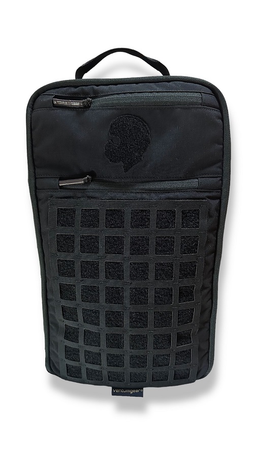 Hinter der Hybrid-Flausch-MOLLE-Fläche verbirgt sich eine flache Einschubtasche für leichte Jacken oder Signalpanels. Darüber verbirgt sich ebenfalls eine flache Einschubtasche hinter dem VENTUMGEAR Logo.