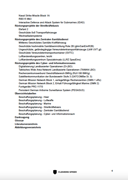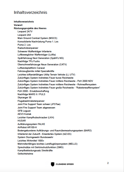 „In diesem E-Book geht es, wie bereits anfangs erwähnt, um die größten und wichtigsten Rüstungsprojekte der Bundeswehr, um die eben angesprochene Vollausstattung zu erreichen”, beschreibt Speer sein Projekt: „Insgesamt umfasst dieses E-Book eine Beschreibung von 100 Rüstungsprojekten. Also deutlich mehr als beispielsweise die regelmäßig veröffentlichten Berichte des Bundesministeriums der Verteidigung zu Rüstungsangelegenheiten. Nach meiner Recherche ist es die umfassendste Übersicht zu den Rüstungsprojekten der Bundeswehr, zumindest im deutschsprachigen Raum, wenn nicht sogar weltweit. Dennoch erhebt diese Übersicht ausdrücklich keinen Anspruch auf Vollständigkeit. Denn die Anzahl der einzelnen Rüstungsprojekte geht in die Tausende und würde somit den Rahmen dieses E-Books deutlich sprengen. Hinzu kommt noch, dass es zu einigen Rüstungsprojekten auch eine oder nur sehr wenige öffentlich zugängliche Informationen gibt, was angesichts der sensiblen Thematik wenig verwunderlich und auch verständlich ist.“