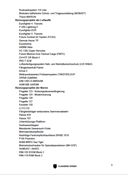 Wer Videos mag, ist da mit Clemens Speers sehr informativen YouTube-Kanal und seinen wöchentlichen Berichten schon sehr gut bedient. Wer Projekte „studieren will“, dem sein Buch „Rüstungsprojekte der Bundeswehr“ empfohlen, das wichtigsten Projekte von Heer über Luftwaffe und Marine bis Cyber- und Informationsraum knackig und knapp zusammen fasst.