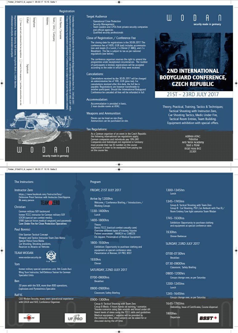 Wodan Security reitet wieder! Im Juli 2017 veranstalten sie die 2. International Bodyguard Conference. Mit dabei: Instructor Zero und anderen Top Ausbilder internationaler Spezialeinheiten. Veranstaltungsort ist Stod, in Tschechien. Im dortigen ATAC Trainingszentrum werden vom 21. bis zum 23. Juli folgende Themen gelehrt und beübt: