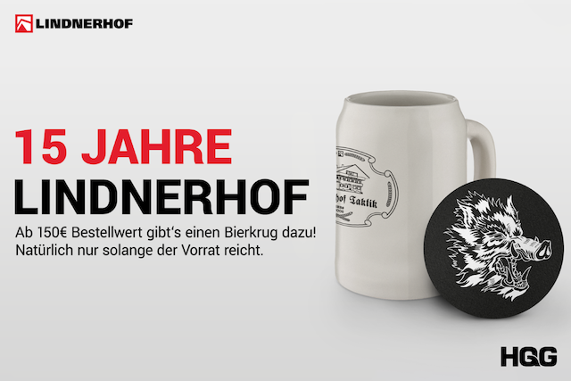 Das bayerische Unternehmen Lindnerhof Taktik feiert sein 15-jähriges Bestehen mit einer Aktion im HQG Online-Shop. Für Bestellungen über 150€ gibt es ein Jubiläumskrug von Lindnerhof und ein HQG- Bierdeckel dazu.