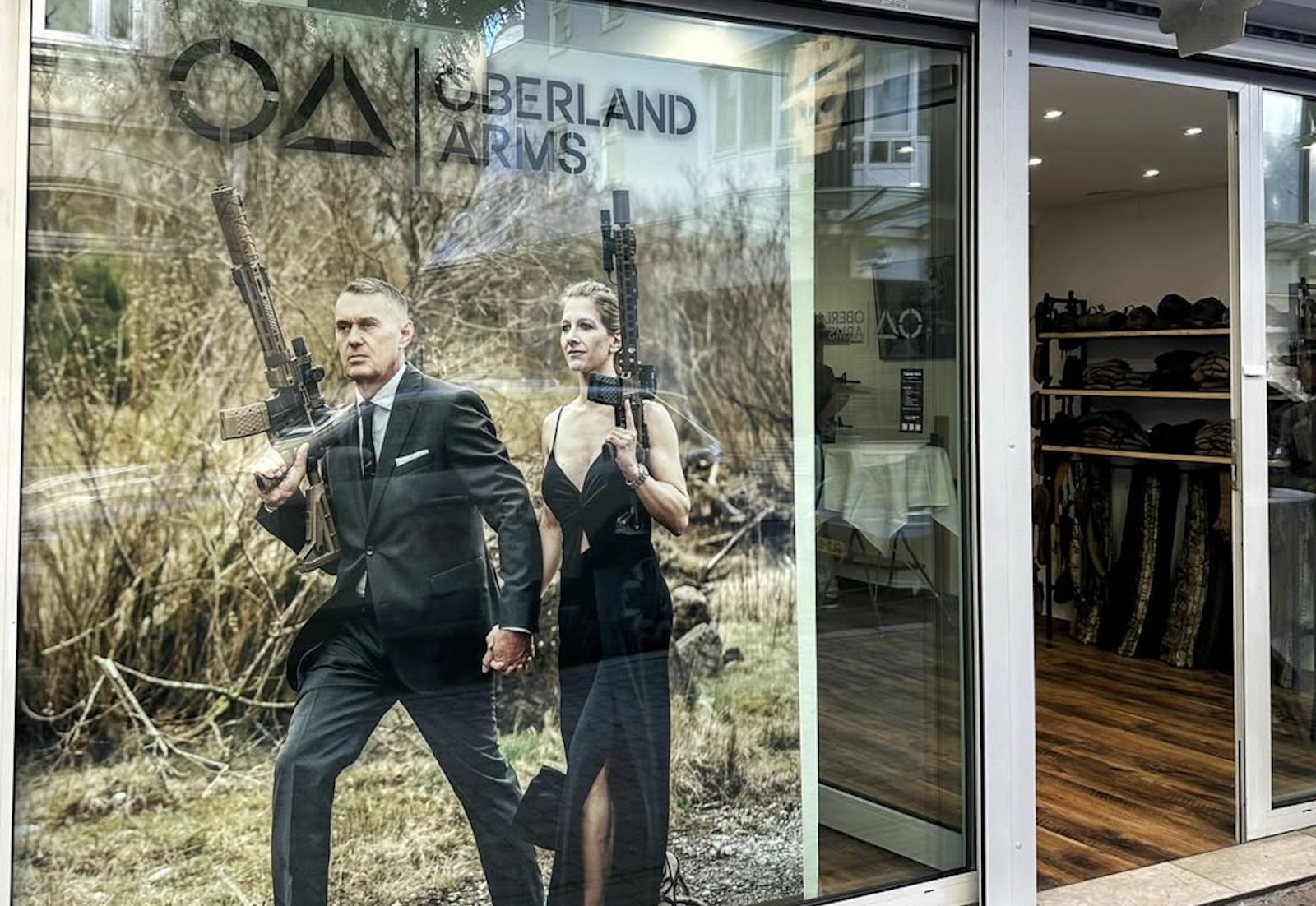 Das Werbesujet zeigt ein großformatiges Foto im Schaufenster eines Geschäfts. Es ist ein elegant gekleidetes Paar zu sehen – ein Mann im Anzug und eine Frau im Abendkleid – beide tragen großkalibrige Waffen. Im Hintergrund ist eine Waldlandschaft abgebildet, darüber befindet sich das Firmenlogo „Oberland Arms“.