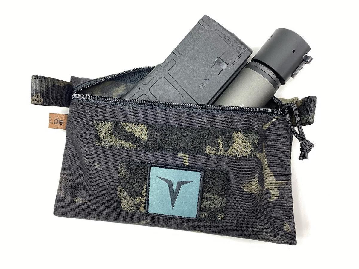 Auf der Front ist Platz für zum Beispiel Namensband und Dienstgrad. Alle Mehrzweckbeutel der Generation 2 haben eine Materialschlaufe aus Fallschirmschnur auf der Innenseite verarbeitet. An der Schlaufe kann zum Beispiel ein Karabiner zur Sicherung von Ausrüstung angebracht werden. Erhältlich im DYOG Webshop.