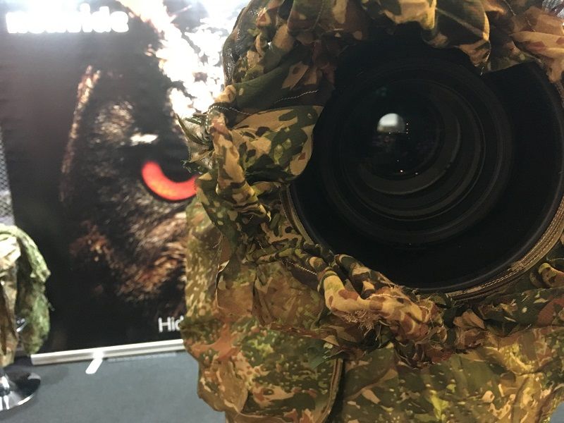 Als Grundstoff für ihre Tarnüberwürfe dient ein feines Netzgewebe in CONCAMO. Im Bild die neue Kameratarnung. Durch das schwarze Loch in der Mitte lugt das beobachtende Objektiv. Im Video oben im Bild gibt es die bewegt Bilder zur Tarnausrüstung.