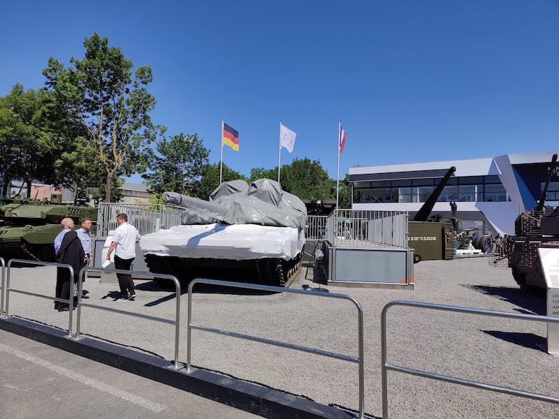 Und daneben steht noch eine Überraschung verhüllt herum: wir tippen auf die Kampfpanzerversion vom Lynx von Rheinmetall. Wir werden euch sagen, was es wirklich ist.