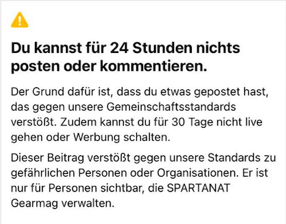 Wir sind draußen. Facebook meint, dass wir nicht berichten dürfen, dass eine islamistische Bewegung die Trucks vercheckt, die sie im Land am Hindukusch grad erobert hat. Der Post der Erregung dokumentiert: