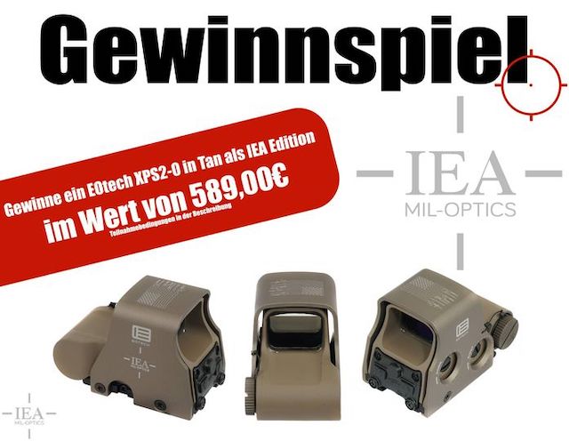 Unter allen Teilnehmern verlosen IEA Mil-Optics ein original EOTECH XPS2-0 in Tan als IEA-Edition im Wert von 589,00,- Euro (Umtausch ausgeschlossen), Teilnahmeberechtigt sind alle ab 18. Gewinnen kann jeder, der ihrer Facebook oder Instagram Seite folgt und dort unter dem Gewinnspielbeitrag drei Freunde markiert.