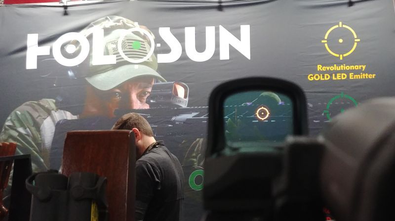 Die Goldfarbe wurde nach langer Entwicklung und vielen Tests optimiert und geht nun bei HOLOSUN in Serie. In den Messehallen, machte es für uns einen deutlich positiven Unterschied und selbst beim Blick in Richtung der Scheinwerfer konnte der Betrachter das Absehen noch gut erfassen.