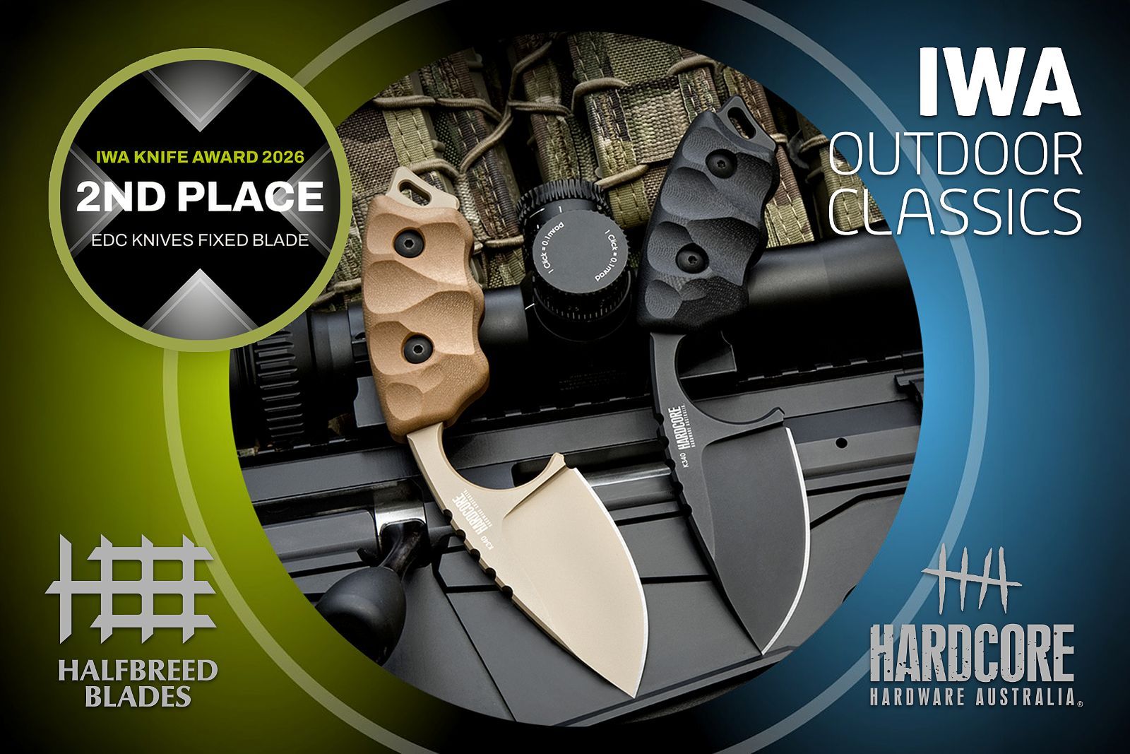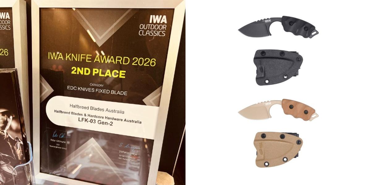Im Rahmen der IWA OutdoorClassics 2026 wurde der IWA Knife Award verliehen. HALFBREED BLADES (HBB) belegte mit dem LFK-03 Gen-2 den zweiten Platz in der Kategorie der feststehenden EDC-Messer. Das robuste Messer aus Böhler K340 Stahl ist für anspruchsvolle Aufgaben konzipiert. Herzlichen Glückwunsch an HBB!