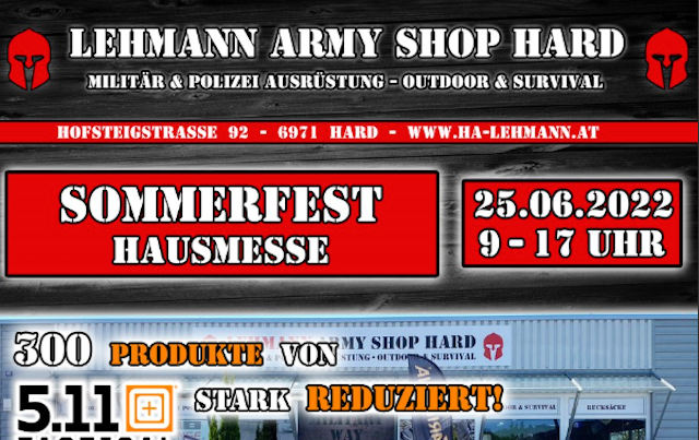 Seid dabei beim großen Sommerfest vom Lehmann Army Shop in Hard. Bei der Hausmesse könnt ihr euch von Kopf bis Fuß ausstatten. Für euch sind diverse Markenvertreter vor Ort, zum Beispiel Carinthia, Tasmanian Tiger, Treven Gear, Katadyn, Yeti und viele mehr. An diesem Tag gibt es für euch top Rabatte sowie Gewinnspiele mit tollen Preisen.
