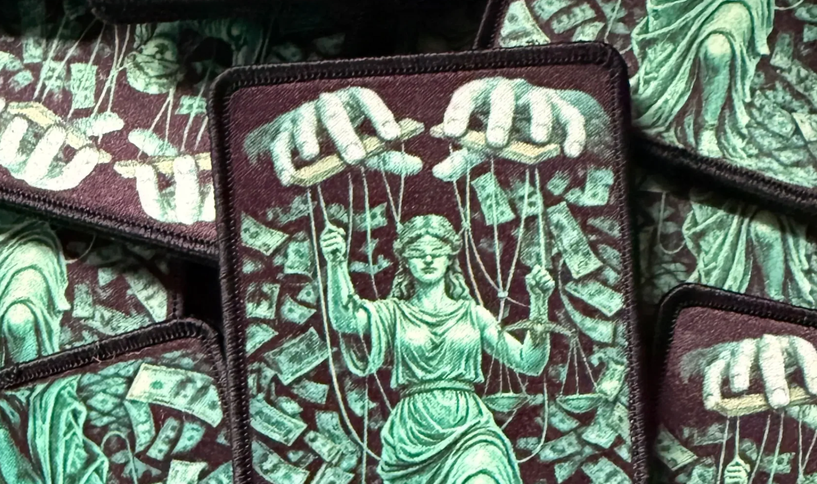 Die Augenbinde steht nicht mehr für Fairness, sondern für Unwissenheit. Die Fäden symbolisieren Druck und Kontrolle. Das Geld zeigt, was die Waage wirklich zum Kippen bringt. Dies ist kein politisches Statement. Es ist eine symbolische Anklage – unbequem, bewusst und unmöglich zu ignorieren. Heute mal ganz kritisch: HIER bei PATCHLAB erhältlich.