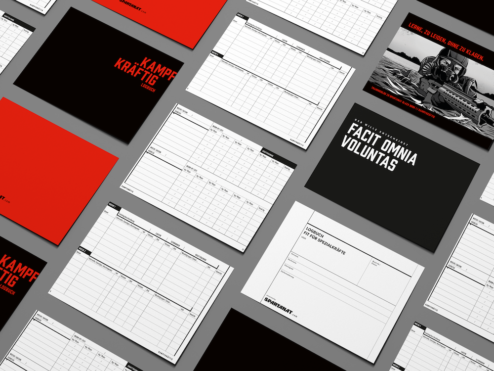 Deswegen haben wir jetzt das KAMPFKRÄFTIG. Logbuch gemacht. Es hat genug Platz, dass Du ein ganzes Trainingsjahr, in dem Du dich fit für die Spezialkräfte oder auch einfach für Dich selbst machst, dokumentieren kannst. Es besteht aus zwei Teilen: dem KAMPFKRÄFTIG Kalender, den du entsprechend dem SPARTANAT Black Book KAMPFKRÄFTIG oder auch frei verwenden kannst, und einem freien Jahresplan für Pumper. Hier darfst Du extra Dein Krafttraining genau dokumentierst. Und zusätzlich Platz für Notizen gibt es auch.