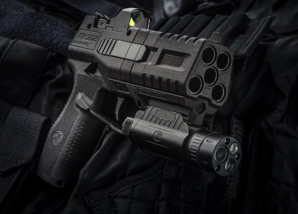 Die neue FN 306™ ist „less lethal“ Pistole mit dem Kaliber 12,55 mm. Das an ihr angebrachte FN Victory-Visier verhindert dabei das Schießen auf das Gesicht, die Waffe soll ja am Körper wirken. Mit einer Reichweite von 10 Metern und einer Kapazität von 5 Schuss ist die FN 306™ effektiver als ein Taser und eignet sich gut zur Unterstützung der Polizei bei der Bekämpfung von mit Messern bewaffneten Kriminellen. HIER gibt es alle Infos zu FN306.