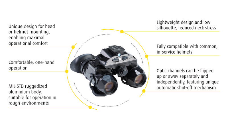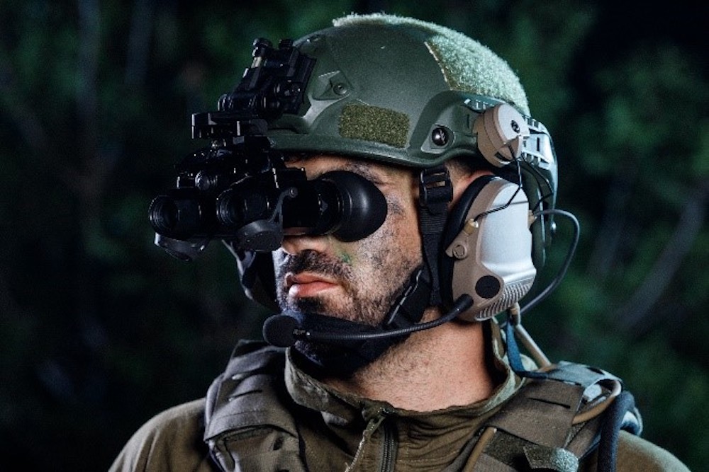 Ein Elitesoldat betrachtet das Bildverstärker-Nachtsichtgerät XACT nv36 von ELBIT. Dieses binokulare System bietet ein Sichtfeld von 47⁰.