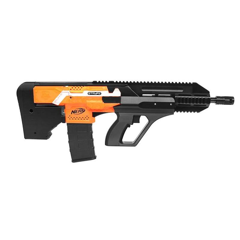 Das Orange ist eine elektrische Nerf Stryfe, die man extra kaufen muss, das schwarze Zeug ist das Modding Kit. Da ist sogar ein PMag für Nerf-Darts dabei. Auf die Rails könnt ihr Eure Optiken und Licht und Laser montieren. Was will man mehr: Viel Spass! Mit knapp 129 Euro nicht ganz günstig, aber sicher ein Riesenspaß. HIER gibt es das 3D Druck Steyr AUG Mod Kit bei AKBlasterMOD.