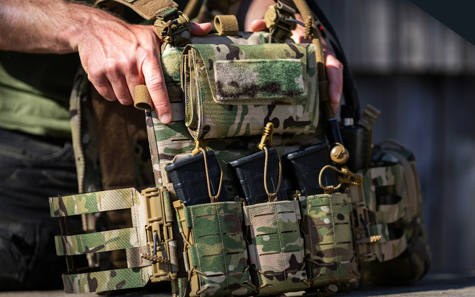 Ein Sortiment aus vertikalen und horizontalen Taschen bietet skalierbare Aufbewahrungsoptionen für Trinksysteme, Kommunikationsgeräte und Zusatzausrüstung. Integrierte Optionen für die Kabel- oder Trinkschlauchführung in Kombination mit Schutzelementen wie umgekehrte Reißverschlüsse und Ablauföffnungen garantieren Zuverlässigkeit auch in anspruchsvollen Umgebungen.