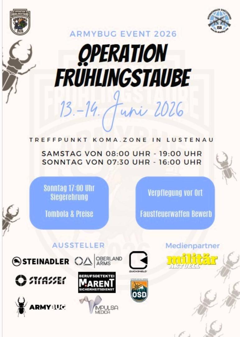 Am 13. und 14. Juni 2026 veranstaltet ARMYBUG in der Koma Zone in Lustenau die Operation Frühlingstaube, ein offizielles Schießevent für Sportschützen. Teilnahmeberechtigt sind Waffenträger und WBK-Inhaber. Aussteller aus der Outdoor- und Waffenszene präsentieren Produkte. Für Verpflegung ist gesorgt.