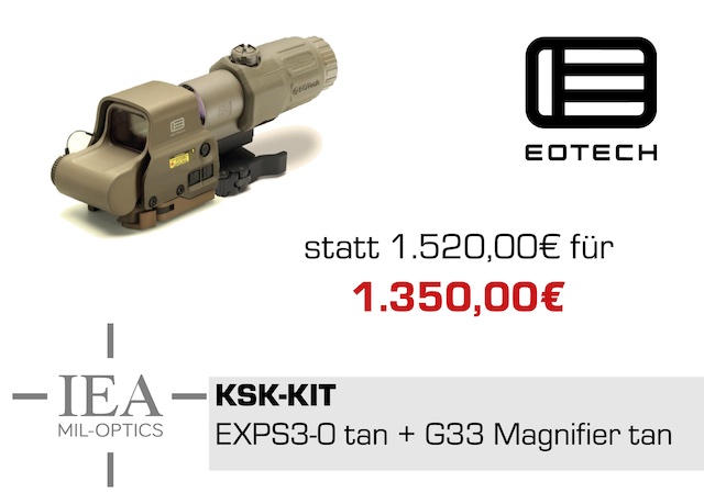 Deutsche Spezialkräfte wissen, was sie wollen. Das KSK verwendet EOTech mit Magnifier. Diese großartige Kombination gibt es immer bei IEA MIL-OPTICS, jetzt aber in einer Aktion zu einem Superpreis: 1.350 Euro statt 1.520 Euro regulär. HIER geht es direkt zum KSK Spezial.