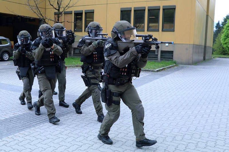 TROMOS heißt „Zerfall“. TROMOS 2017 war am 5. Mai 2017 erstmals in Österreich eine Landesübung, die sich dem Großthema Terror widmete. Annahme: Attentat auf eine Großveranstaltung. Sinn: Zusammenarbeit der Einsatzkräfte von Rettung, Polizei und Militär. Wir picken uns nur die interessanten Gearaufnahmen heraus: Oben im Bild geht die Militärpolizei vor. Sie wird als starke Unterstützungkraft für den urbanen Bereich aufgebaut, dementsprechend schwere Plattenträger, Helme mit Vollvisier, direkter Einsatz gegen den Terror ist das Ziel.