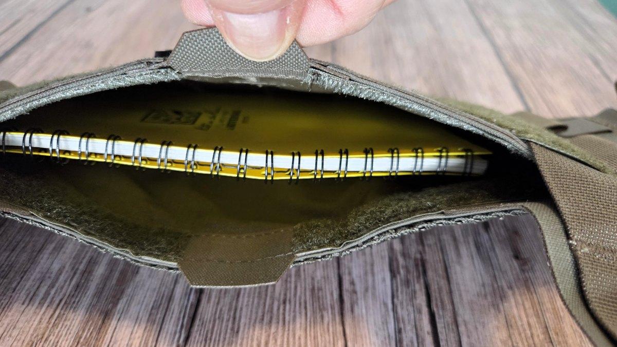 Dahinter befindet sich eine Kartentasche, versehen mit zwei Pull Tabs. Die Kartentasche innen ist nicht unterteilt und verfügt weder über Stifthalter noch über Klettflächen. Leider sehr schwer zu erreichen, wenn ein Placard mit Magazinen vorne angebracht ist.