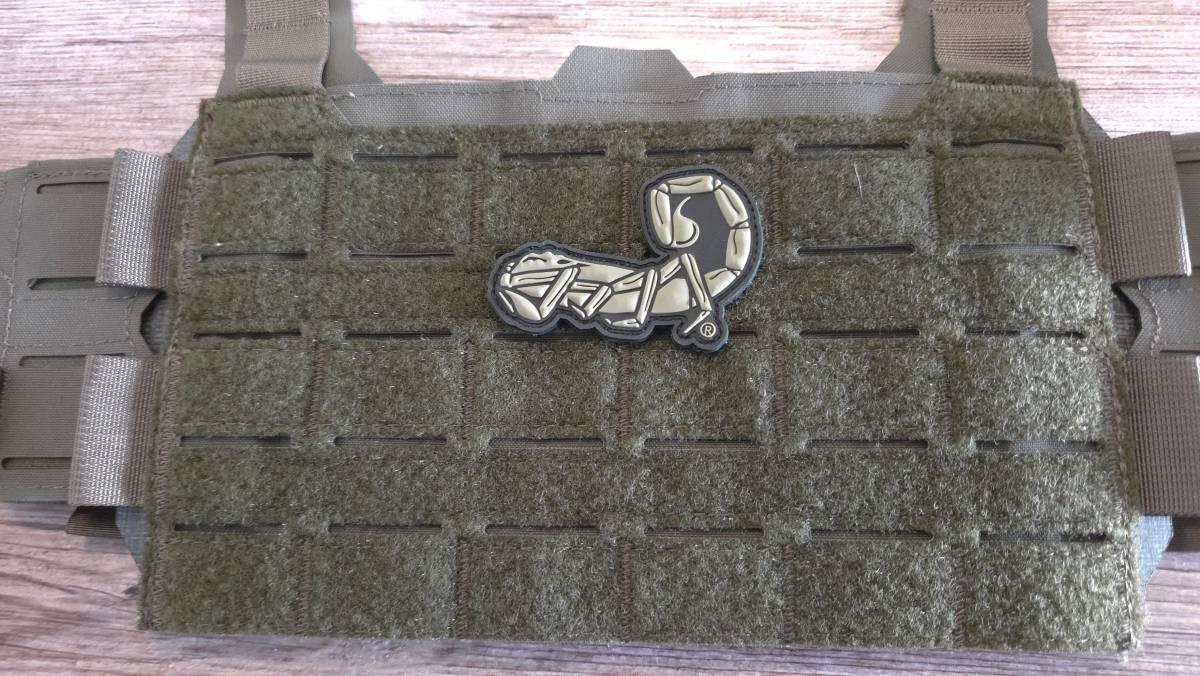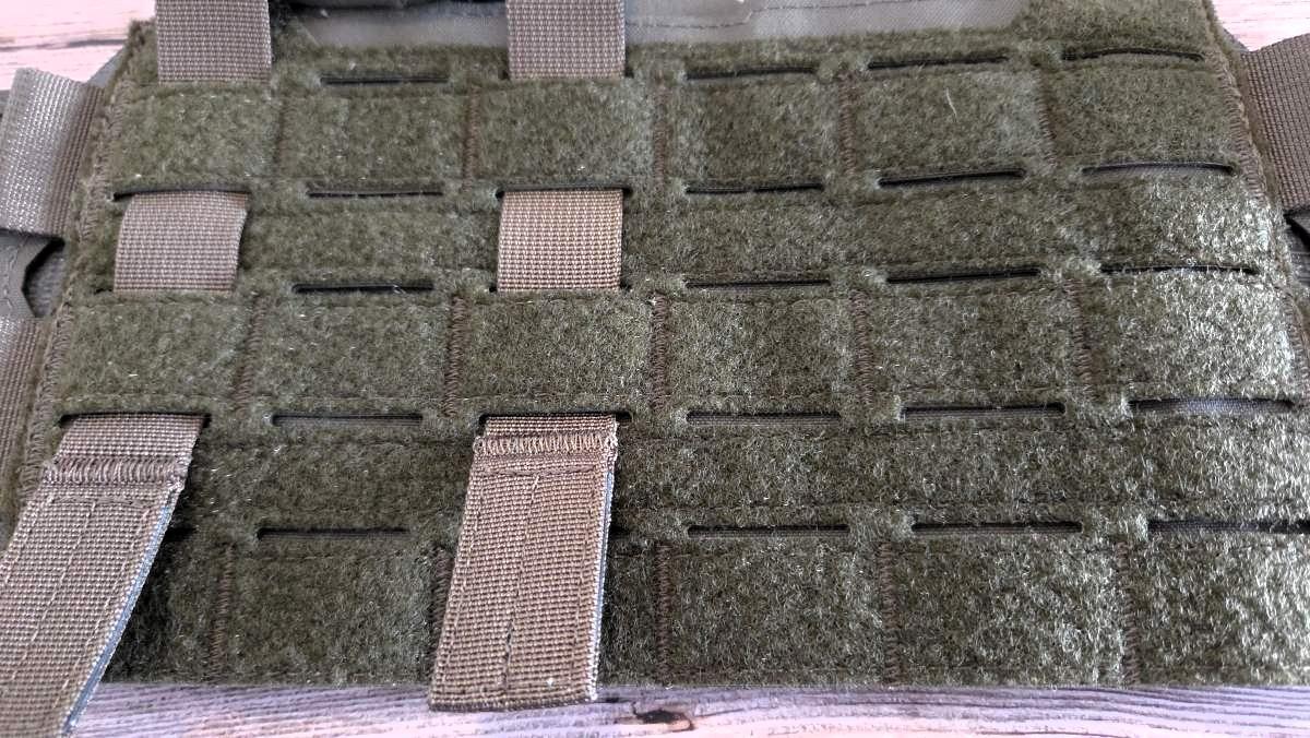 Wir haben vorn eine 250 x 150 mm große Klettfläche, auf der sechs lasergeschnittene MOLLE/PALS-Spalten angeordnet sind.