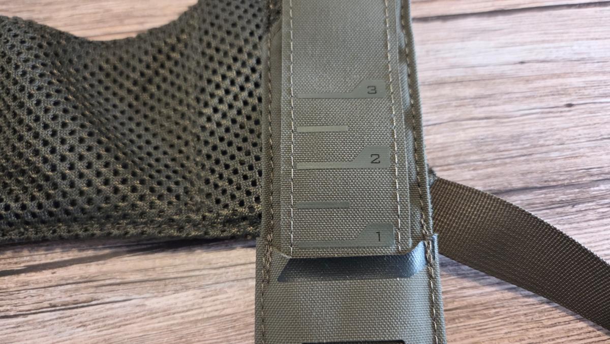 Im Gegensatz zu den meisten anderen Chest Rigs, bei denen das Rig hinten verstellt wird, wird das Reaper Rig vorn verstellt, was schnelle Anpassungen ermöglicht, ohne dass es abgenommen werden muss.