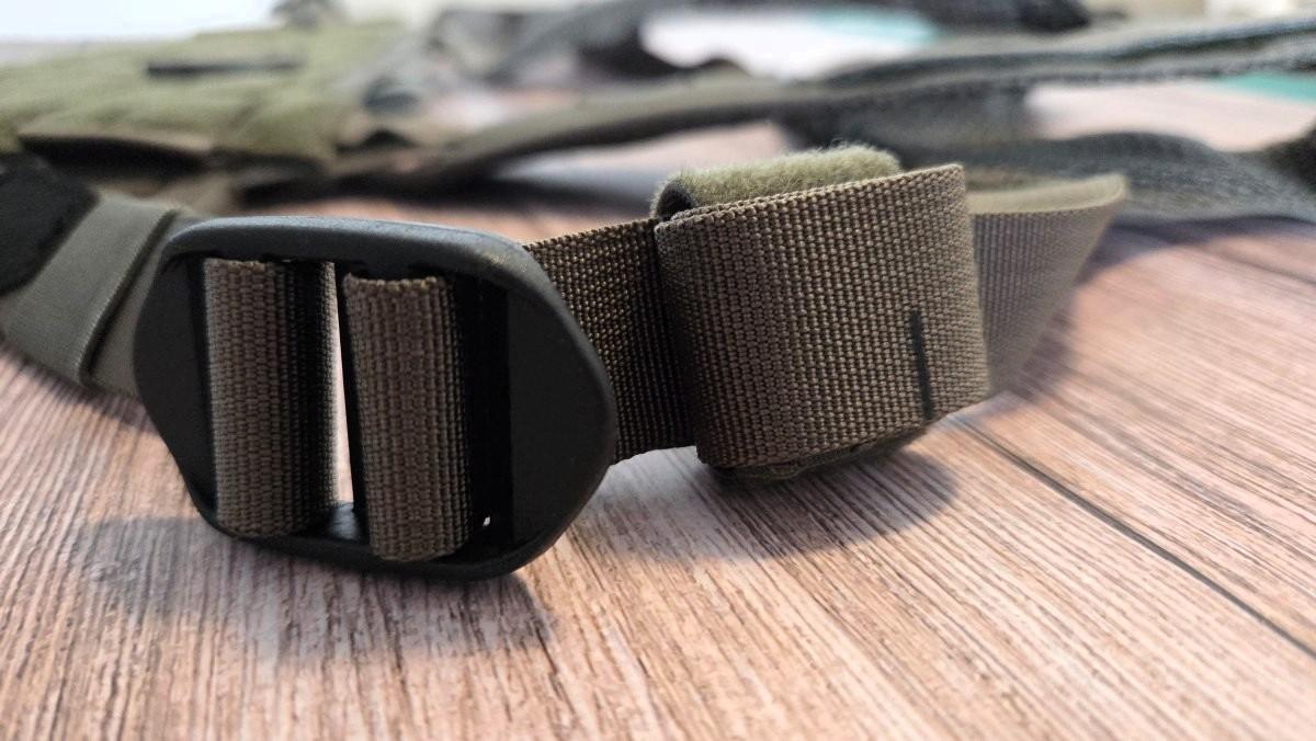 Wie überall am Reaper Rig kann das überschüssige Gurtband aufgerollt und mit Velcro One Wrap befestigt werden. In diesem System kommen ausschließlich kompakte Leiterschnallen zum Einsatz. Das hat den Vorteil, dass der Anwender das Rig weiter oder enger einstellen kann.