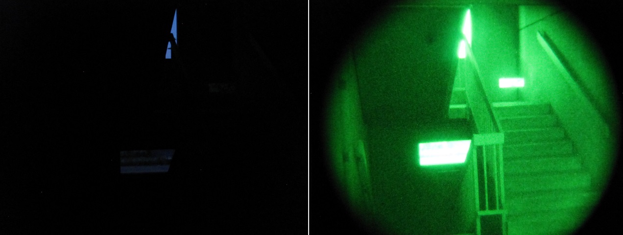 lunox9Hier noch eine Gegenüberstellung, bloßes Auge versus Restlichtverstärkung (ohne zusätzlichem IR-Aufheller). Das Ergebnis spricht für sich.