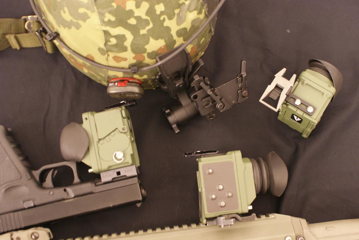 Nun zum Äußeren. Die Vorderseite beherbergt das Objektiv, welches unter einem Deckel aus Titan verborgen ist. Zum Einschalten des WBGs muss diese Klappe lediglich heruntergeklappt werden, und fürs Ausschalten wieder nach oben. An der linken Seite befinden sich die Bedienknöpfe für das Menü, Filtermodus, Zoom und Bildschirmhelligkeit (10 stufig). An der rechten Seite das Batteriefach und darüber – unter einer Abdeckung verborgen – die Montagestelle für Laser, Funkübertragungsmodule usw. An der Oberseite ist der Montagepunkt für diverse Helmadapter zu sehen (im Bild Spuhr), diese Helmadapter können direkt über Andres Industries für alle gängigen NVG-Mounts (Rhino, Dovetail, Spuhr) bezogen werden. An der Unterseite ist die Railmontage befestigt. Bei der zivilen Version ist das nachträgliche Anbringen nicht möglich! Zum Größenvergleich das Timro 640m neben einem Mini14 (PVS14) NVG.