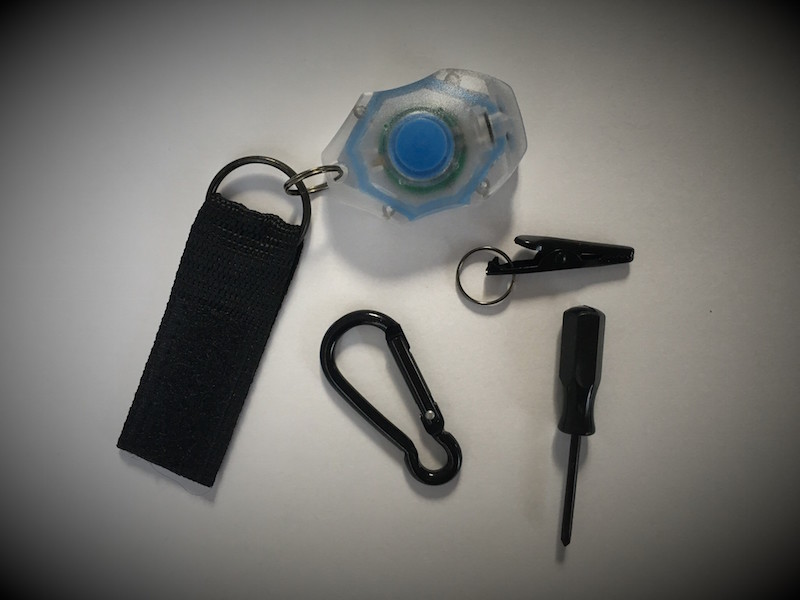 Die beste Lichtausbeute hat man mit zwei CR-2016 Batterien. Davon sind auch gleich zwei im Lieferumfangenthalten. Dazu gibt es noch einen kleinen Schraubenzieher, um das Gehäuse zu öffnen und einen Anhänger (korrosionsfest) mit verschiedenen Befestigungsmöglichkeiten. Man kann die Lampe auch sehr gut mit Klett bekleben und auf die Ausrüstung setzen, da sie so klein und leicht ist – kein Problem.