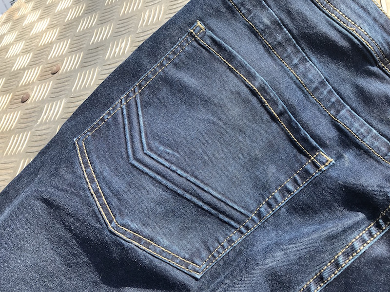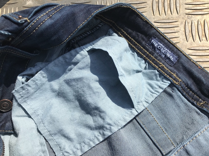 Detail der Gesäßtasche. Wie schon gesagt, auch diese sitzt relativ tief. Und sie ist ebenfalls eher groß. Wir neigen dazu, darin unsere Brieftasche zu versenken. Und sie ist da gut aufgehoben. Auch beim Autofahren ist sie nicht im Weg und drückt nicht.