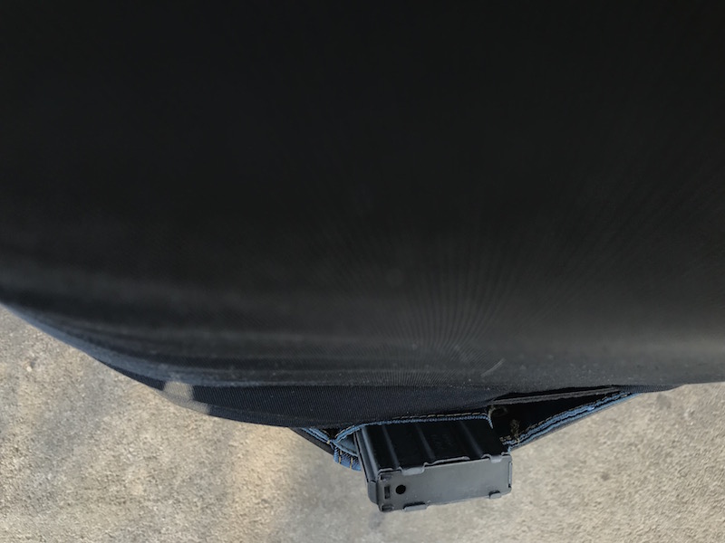 Solang ihr einfach geladen rumsteht, ist das mit dem Magazin kein Problem. Wenn ihr euch aber hinsetzt, setzt sich der tiefe Sitz der Hose durch und in diesem Fall frißt der Arsch nicht Hose, sondern das Magazin. Bildlich gesprochen. De facto lehnt sich das Magazin wie ein Einhorn raus. Auch kein größeres Problem, wenn hinten Luft ist. Im Auto sitzen mit eingeklemmten Magazin macht freilich weniger Spaß.