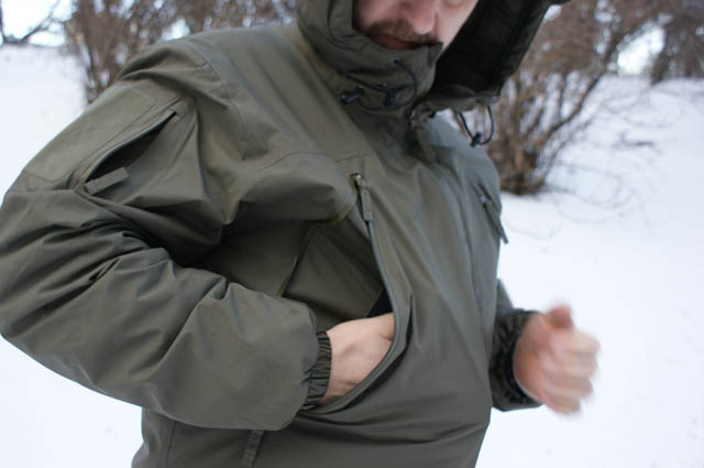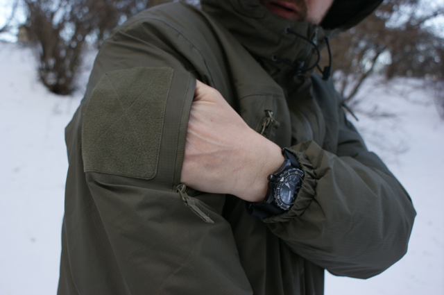 An den Oberarmen gibt es Klett. Wer kann schon ohne Patches leben? Und ein handgroßes Fach zum Verstauen von Utensilien. Unter der Achsel, also nicht zu sehen, ist eine Lüftungsöffnung, die aufgezippt werden kann. Mann die Jacke also auch etwas der Temperatur anpassen.