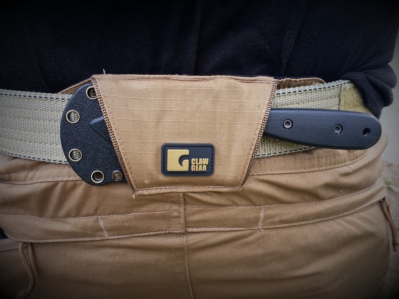 Auf der Innenseite der Schlaufen findet sich glattes Cordura, damit der Gürtel besser gleitet. Die mittlere hintere Schlaufe ist breit und V-förmig – sie bietet zusätzlich Schutz und Platz für Messerscheiden. Auf der Scheide ist ein Claw Gear Rubber Patch vernäht.