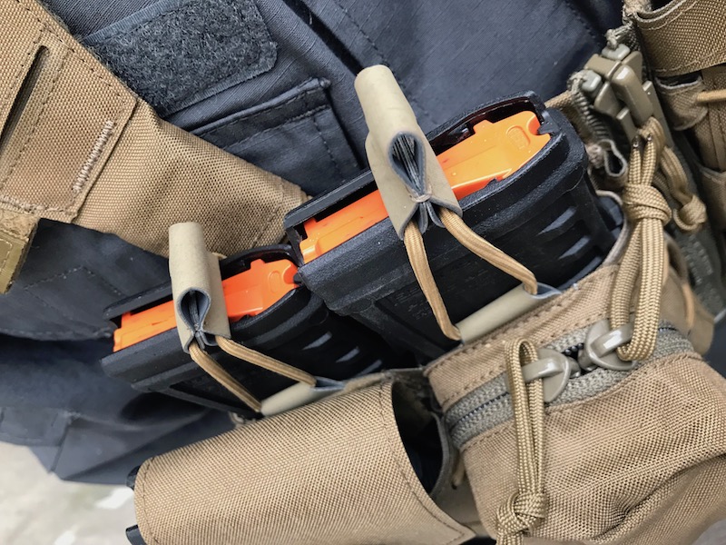 Wenn das Ganze schon so schön aufgeteilt ist, gehen wir zuerst einmal nach rechts der Mitte. Wir sehen, dass zwei Magazine mit Bungee Cord am Platz gehalten werden. Der Rig nimmt AR15 und AK, obendrein passen auch .308 Magazine.
