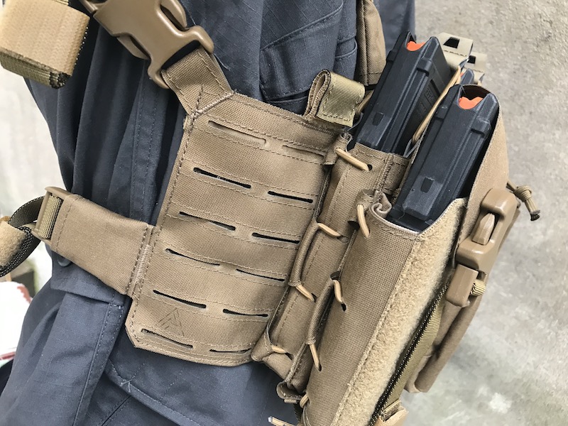 Über Körbchengrößen wollen wir hier nicht diskutieren. Man sieht Bungee Cords mit denen der Träger die Magazintaschen in der Breite einstellen kann. Und wie super ein Split Front Chest Rig zu öffnen ist. Wir lieben das, weil man ihn wie eine Weste normal anlegen kann. Kein lästiges Arbeiten über Kopf. Und wer gerne am Bauch liegt: es gibt sogar ein spezielles Sniper Panel, das man beim Hurricane einzippen kann, dann ist in der Mitte alles flach und die Taschen rücken zur Seite.