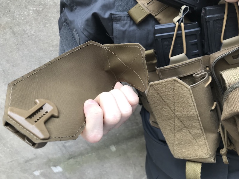 Der Chest Rig ist insgesamt sehr komplex. Wir fangen in der Mitte an: „Spalter, Spalter!“, will man da gleich ausrufen. Und das ist gut so. Den Split Front ist großartig zum An- und Ablegen des Rigs. Der Reißverschluss öffnet von oben nach unten, schließt also von unten nach oben. Das ist ideal zum Einfädeln. Und wenn geschlossen ist, wird oben noch mit einem Rigel zugeklipst, damit im Einsatz nichts aufgeht und man oben ohne da steht.