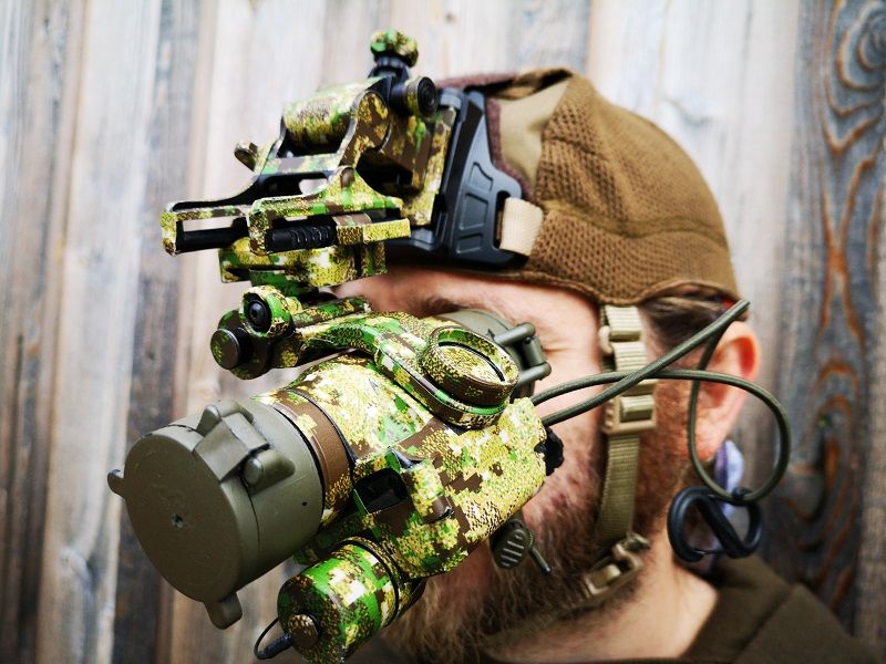 Hier der Scalp in Verwendung mit einem PVS14 und einer selbstgezimmerten Gegengewichtstasche. Ja, wir haben diese Tasche absichtlich schräg am Hinterkopf befestigt. Bei einem Monokular ist das zu empfehlen, da sich das Ganze so um einiges bequemer trägt.