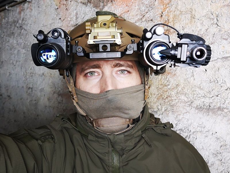 Da kommt die Möglichkeit, die Röhren zum Helm hin zu klappen, ins Spiel. Dadurch wandert der Schwerpunkt wieder näher zum Helm und die Nackenmuskulatur wird weniger belastet. Ein kleiner Nachteil wäre, dass es nun etwas länger dauert bis das Nachtsichtgerät wieder vor den Augen einatzbereit ist. Man kann eben nicht alles haben, entweder schnell einsatzbereit oder bequem tragen, wenn es nicht im Gebrauch ist. Eine sehr philosophische Frage, bei der sich die Geister scheiden.
