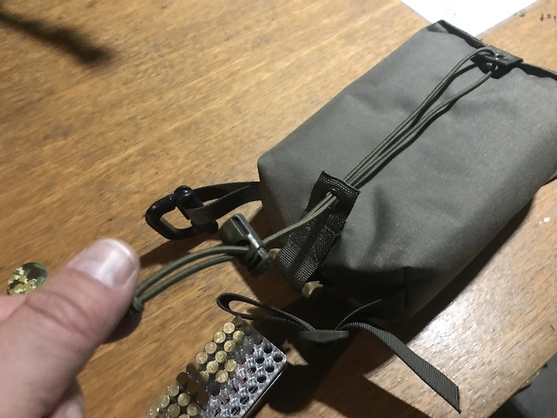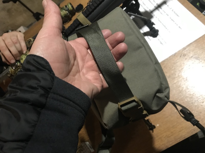 Der Rundgummi mit Kordelzug läßt sich schnell anpassen und sowohl um den Schaft als auch um den Oberarm schlingen. Eine nicht uninteressante Tragevariante für den schnellen Stellungswechsel.