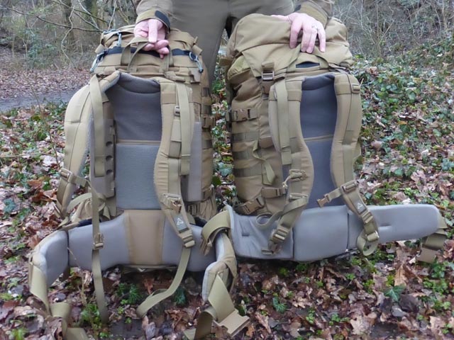 Der Beckengurt des Futura Harness ist komplett abnehmbar und hat auf jeder Seite 2 Reihen Molle mit 6 Schlaufen. In der Mitte befindet sich ein großer Fastexverschluss, der nach hinten festgezurrt wird. An der Seite des Futura Harness™ sind die sogenannten Bolster (BVS), die den Rucksack beim Tragen eines Plattenträgers fixieren. Diese sind komplett und schnell mit Fastexverschlüssen entfernbar, wenn nicht benötigt – allerdings stören sie in keinster Weise beim Tragen ohne Plattenträger, man wird das wenn nur aus Gewichtsersparnis machen.