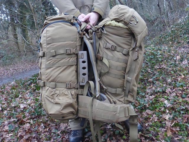 Für Mörser und 50iger werden außerdem noch kleine „Socken“ mitgeliefert, in denen dann das Ende der jeweiligen Waffe ruht. Da zum Test weder Mörser noch 50iger zur Verfügung standen, sieht man hier ein reguläres AR10 Gewehr, dass mit dem Schaft in einer der beiden „Socken“ steckt. Auf den Bildern sieht man gut, wie man ein kurzes Gewehr auch tragen kann, wenn das Bodenpanel verwendet wird. Der Tragekomfort mit einem Gewehr ist relativ fein, wenn man allerdings viel Gewicht im Hauptfach hat, trägt sich der Rucksack natürlich schlechter, je weiter der Rucksack vom Rücken weg ist. Weiterhin ist das System nicht für den schnellen Zugriff wie z.B. bei Eberlestock gemacht – eine Waffe schnell zu ziehen ist ein Ding der Unmöglichkeit. Der Rucksack ist aber auch nicht dafür vorgesehen. Der Overload ist hauptsächlich für schwere Unterstützungswaffen bei längerem Transport gemacht.