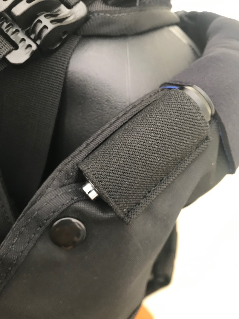 Die Montage an der anderen Seite der Brust. Die PSLV kann aber auch mit einem Harness oder mit Riemen angelegt werden. Hinter der Hülle verbirgt sich ein programmierbarer Unterwasser-Inflator, er ist das Gehirn des Systems.