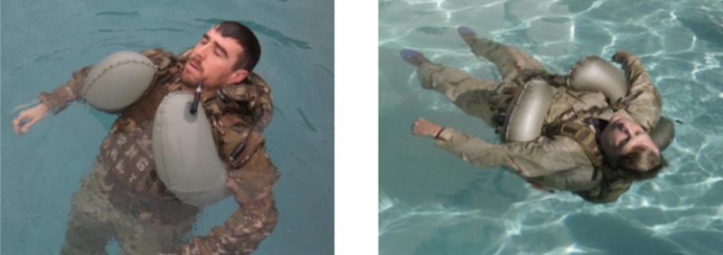 Die PSLV Weste passt sich stromlinienförmig an den Körper an, wobei die Arme dazu benutzt werden, um die Weste zu halten. Die innen liegende Blase ist dabei auch vor der Ausrüstung am Mann geschützt.