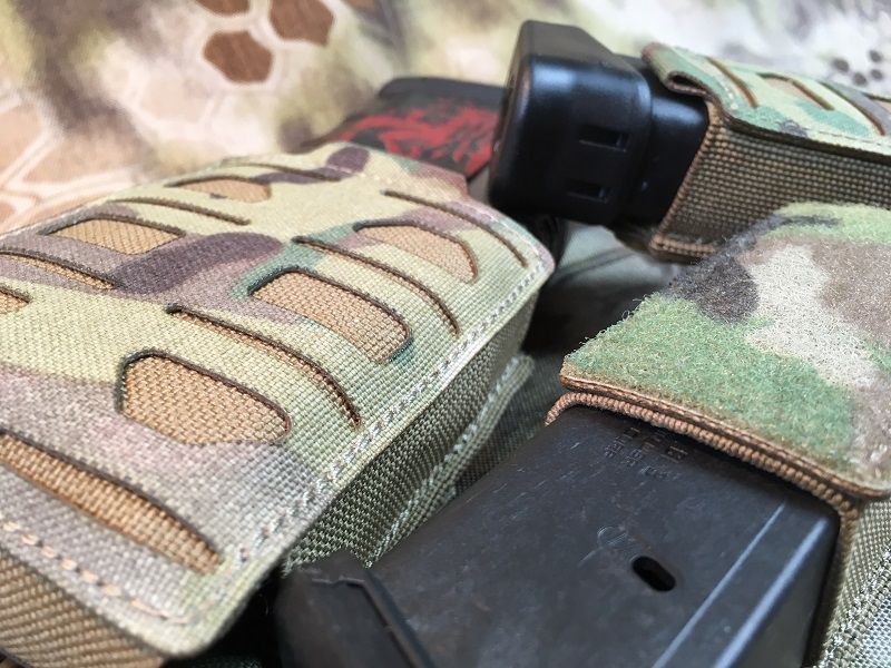 Beginnen wir mit dem Skewer Laser-cut Pistol Mag Pouch. In die Front ist mit einem Laser ein etwas eigenwilliges PALS-Raster geschnitten worden. Durch die Zwischenräume wird aber etwas Gewicht gespart und bei der Montage von anderen Taschen sind sie sehr hilfreich.