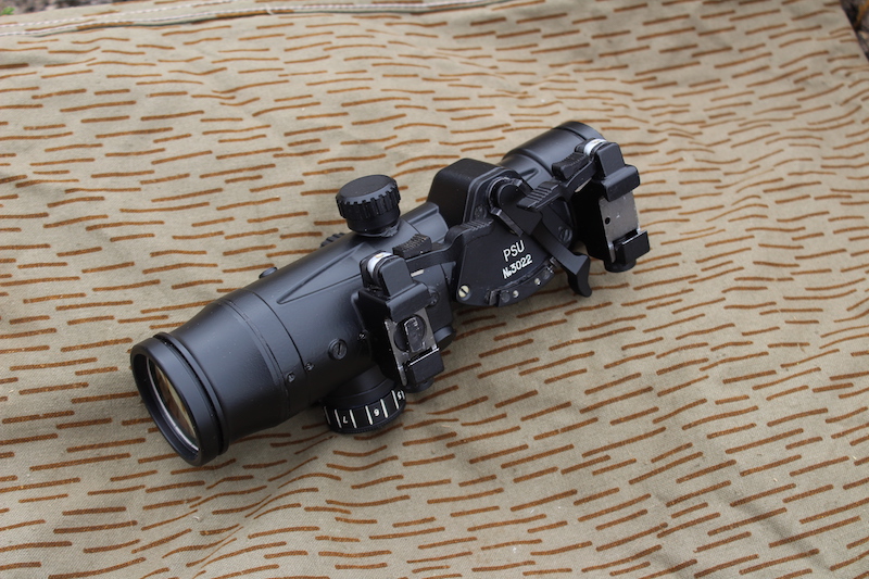 Die Optik weißt eine Besonderheit auf: sie kann eben mit Hilfe eines Hebels zwischen einfacher und vierfacher Vergrößerung schnell schalten. Das erinnert uns nicht nur an das Elcan Specter DR, sondern ist sicher davon inspiriert. Das Bild oben von Russianoptics zeigt den direkten Vergleich zwischen den zwei Optiken. Das PSU ist ähnlich, aber kein direkter Nachbau.